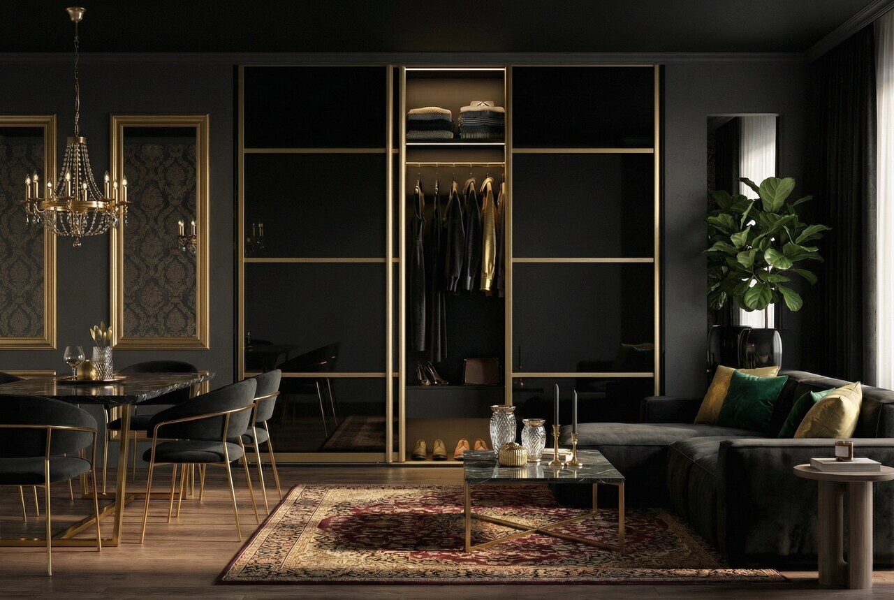 Kolejnym krokiem mogą być czarne meble – np. stolik, komoda lub nowoczesna zabudowa RTV, czy regał w systemie Orto z czarnymi profilami. Tego typu elementy świetnie prezentują się na tle białych lub szarych ścian. Osoby odważniejsze mogą zdecydować się natomiast na czarny kolor ścian w jednej ze stref pomieszczenia – np. za kanapą lub łóżkiem – dzięki czemu wnętrze zyska nową perspektywę. Warto też pamiętać o wykończeniach: czarne listwy przypodłogowe, oprawy lamp, przełączniki czy ramy luster mogą subtelnie, ale jednocześnie skutecznie uzupełnić kompozycję. A jeśli szukasz naprawdę oryginalnego sposobu na wprowadzenie czerni do wnętrza, koniecznie poznaj system przeszkleń Lumi w czarnym kolorze - to niebanalne, ale bardzo praktyczne rozwiązanie.