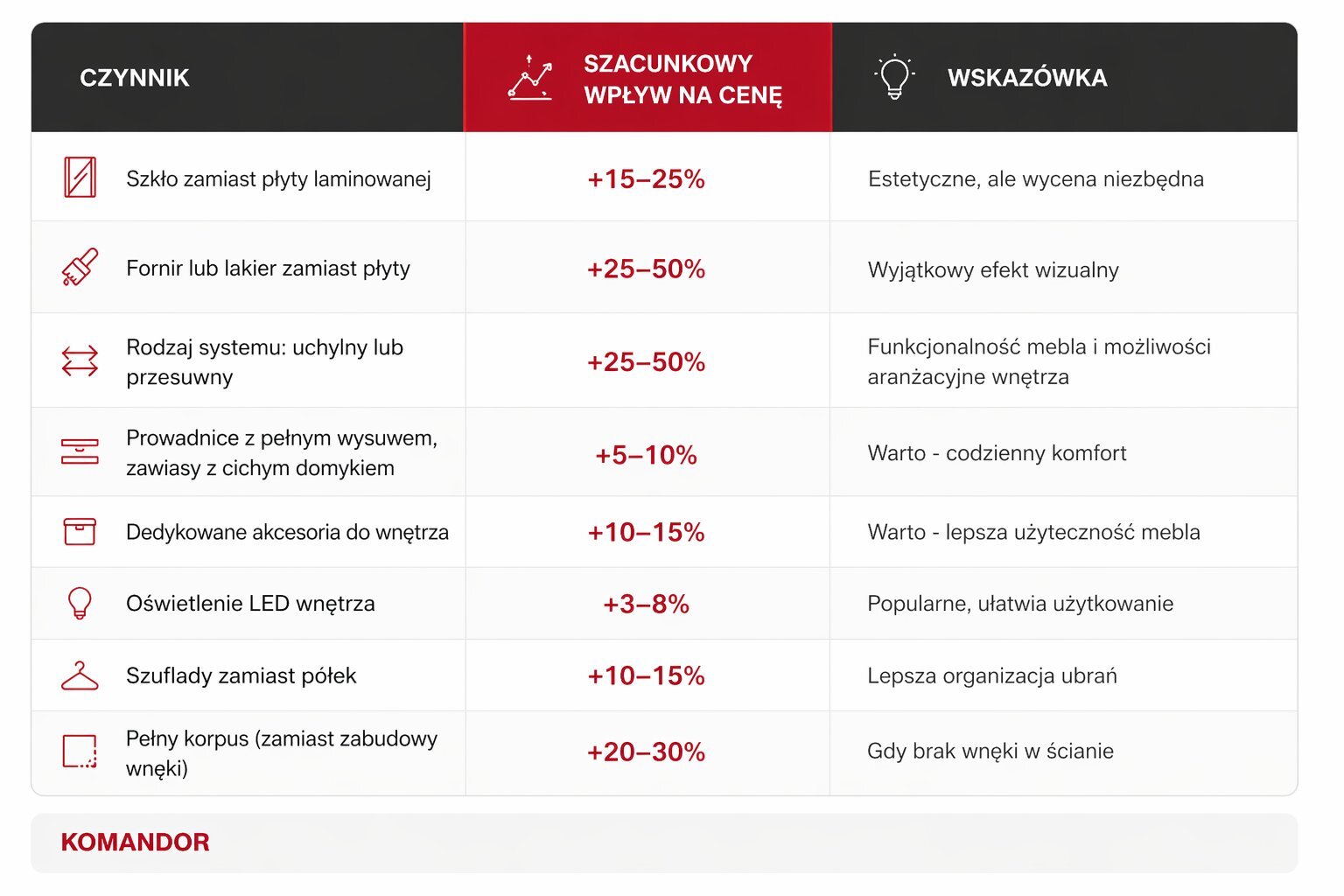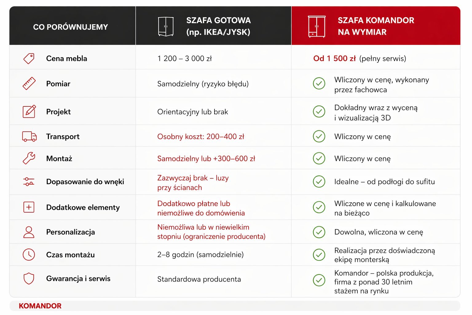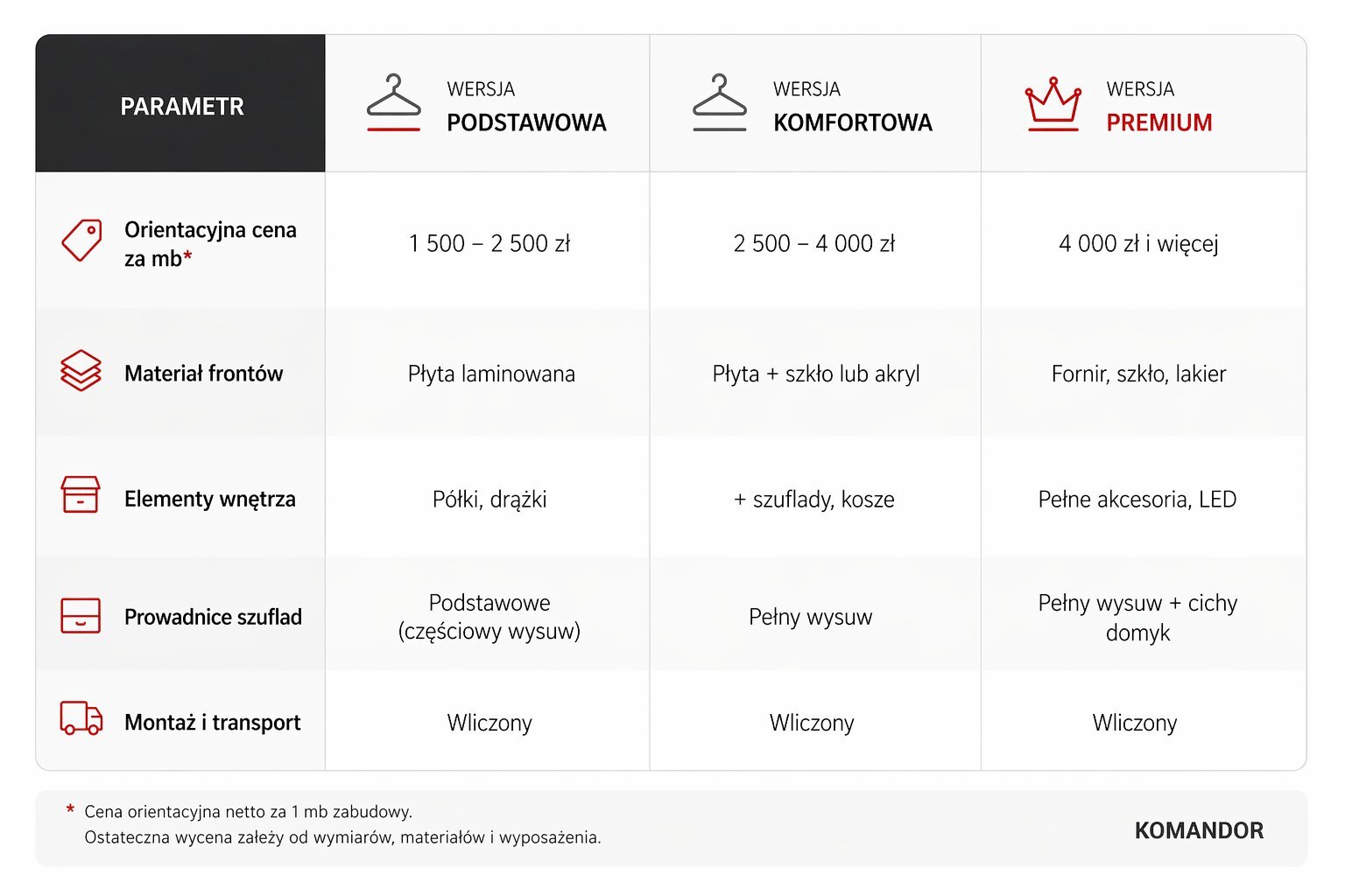 Szukasz konkretnej odpowiedzi na pytanie o cenę szafy na wymiar? Dobrze trafiłeś. W tym artykule znajdziesz orientacyjne przedziały cenowe, tabelę porównawczą z szafami gotowymi, listę czynników, które podnoszą lub obniżają koszt mebla, oraz odpowiedzi na najczęstsze pytania klientów przed zakupem. Jedno zastrzeżenie na wstępie: cena szafy na wymiar nie jest jak cena kilograma jabłek – nie ma jednej liczby, która pasuje do każdego. Jako producent nie lubimy uogólnień i podawania ceny za metr szafy, bo taka kalkulacja nie ma sensu. Ale możemy pokazać Ci, z czego ta cena wynika i jakiego rzędu kwot możesz się spodziewać, zanim umówisz się na wycenę.
